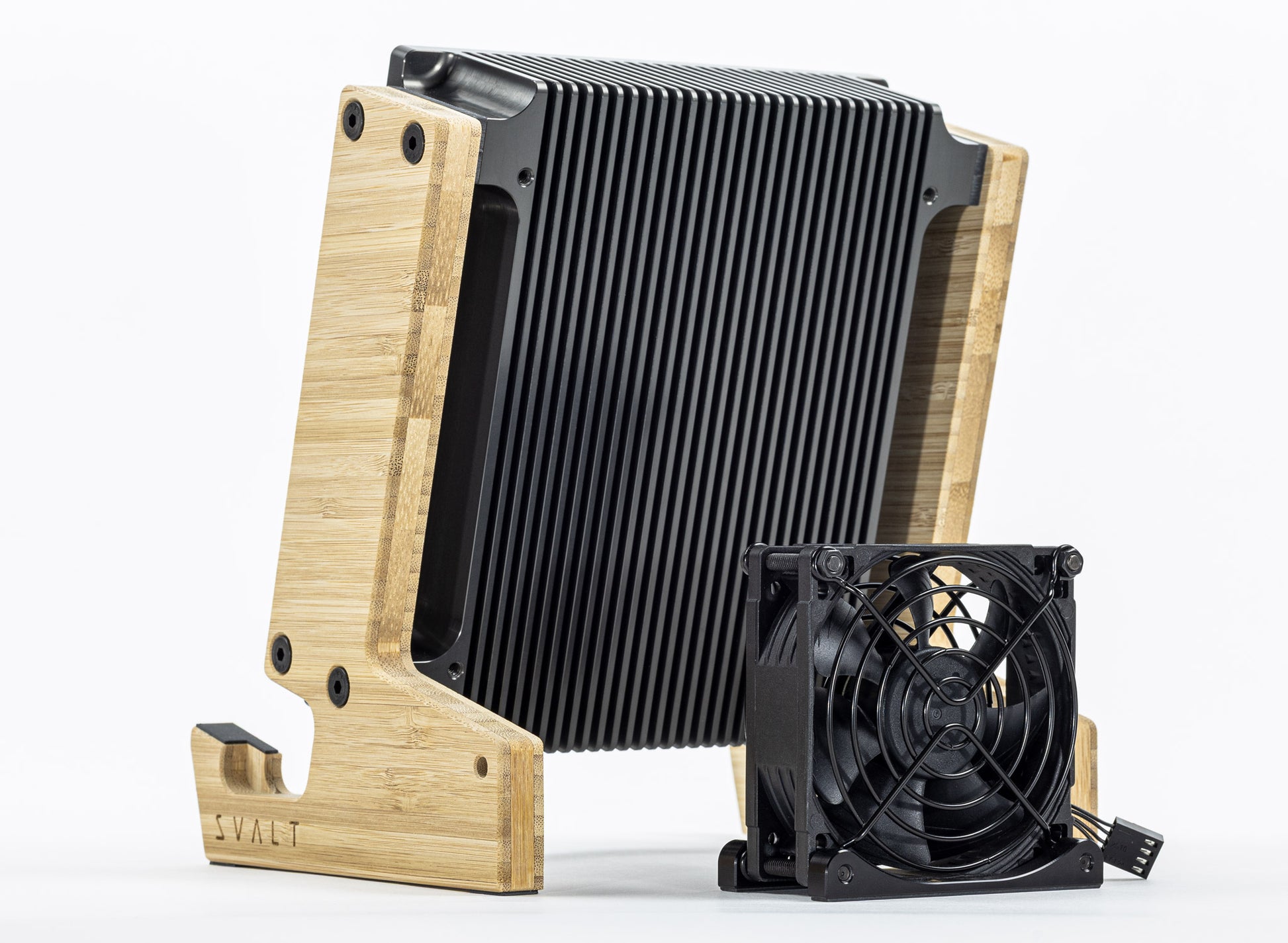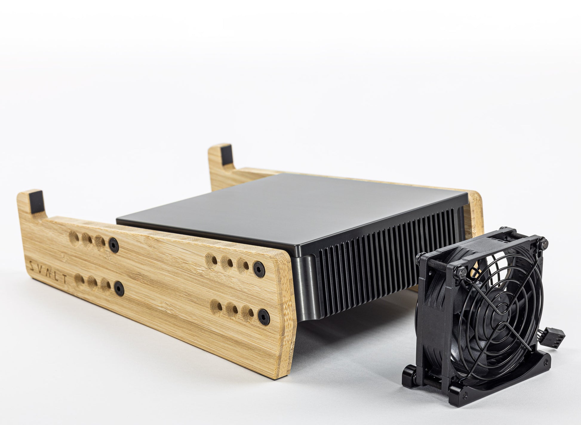- 2 x SVALT Cooling Fan model Fx black anodized aluminum 80mm fan support feet with non-slip pads.